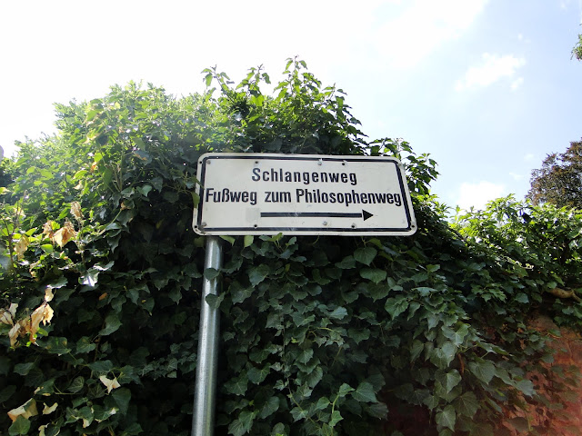 拍完照沒有立即過橋,先鎖定預計體驗的哲學家步道。步道入口會從馬路旁的蛇徑進去,還好事前有做功課,記住了哲學家小徑 (Philosophenweg)、蛇徑(Schlangegasse)兩個重要又沒看過的單字,要留意下面這個路標喔!